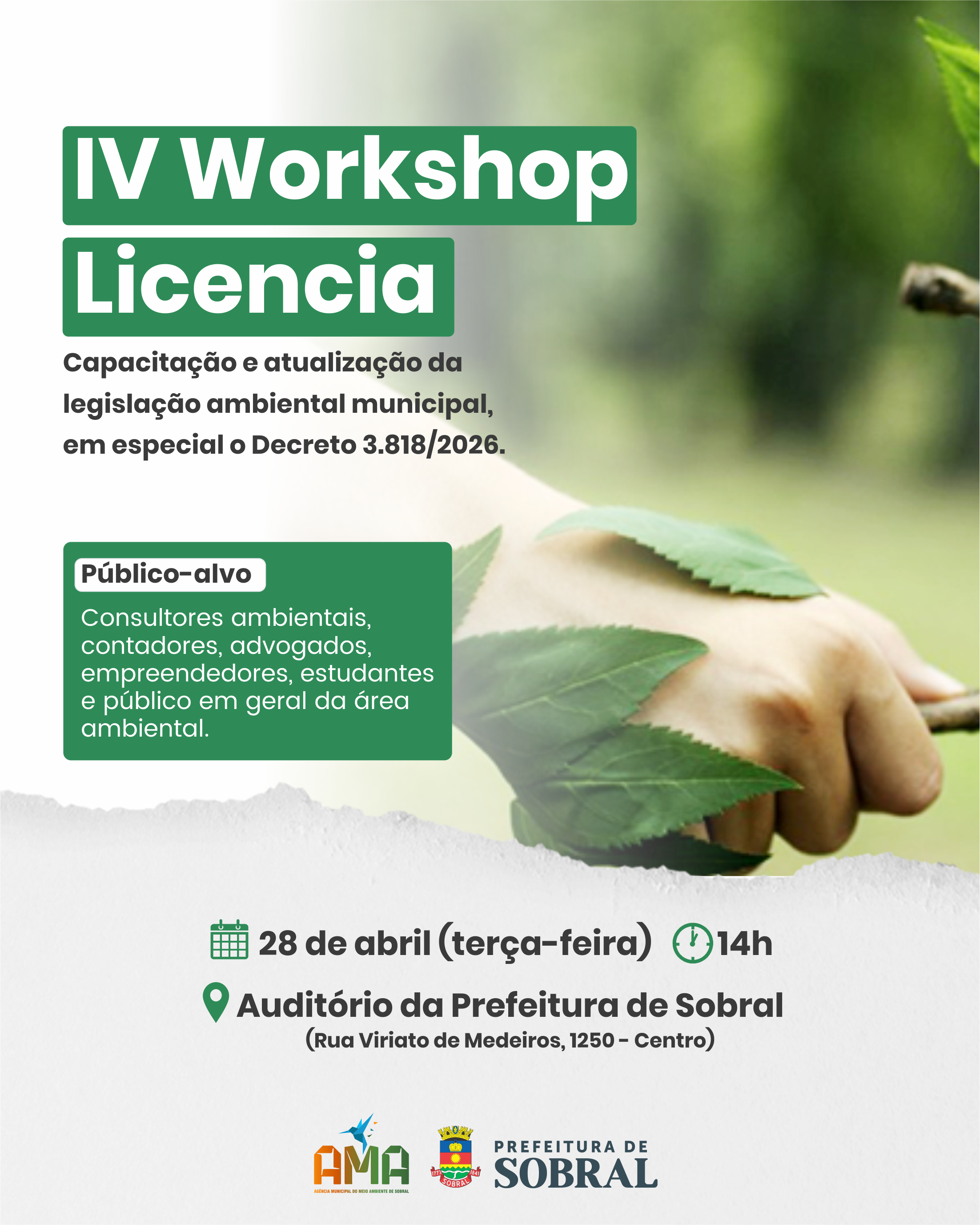 A Prefeitura de Sobral, por meio da Agência Municipal do Meio Ambiente (AMA), realiza, na terça-feira (28/04), o IV Workshop de Licenciamento Ambiental. O encontro acontecerá às 14h, no auditório da Prefeitura, reunindo profissionais e