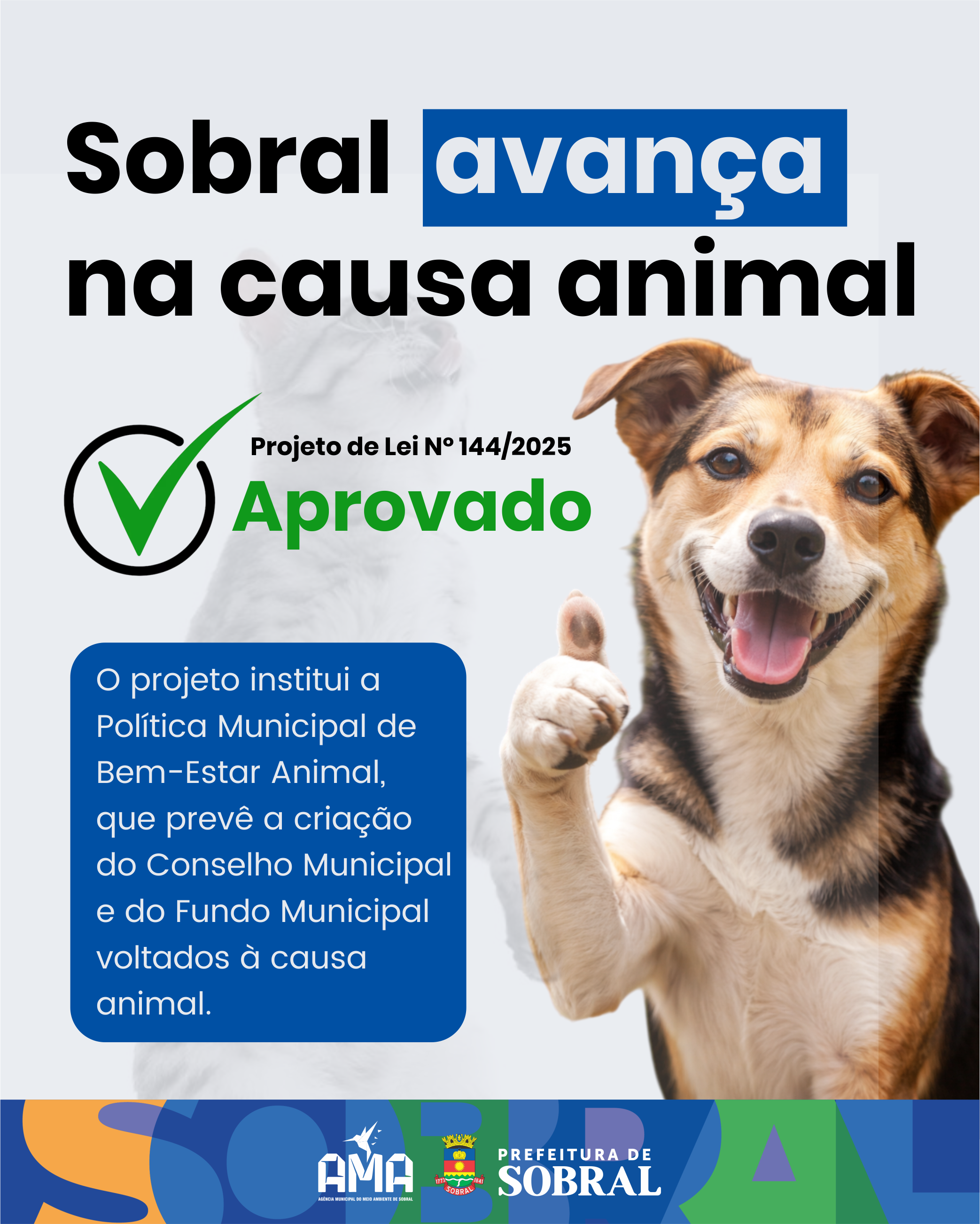 A Prefeitura de Sobral, por meio da Agência Municipal do Meio Ambiente (AMA), celebra a aprovação, nesta segunda-feira (16/12), na Câmara Municipal de Sobral, do Projeto de Lei nº 144/2025, que institui a Política Municipal de Bem-Estar Animal. A proposta foi aprovada por unanimidade, representando um avanço