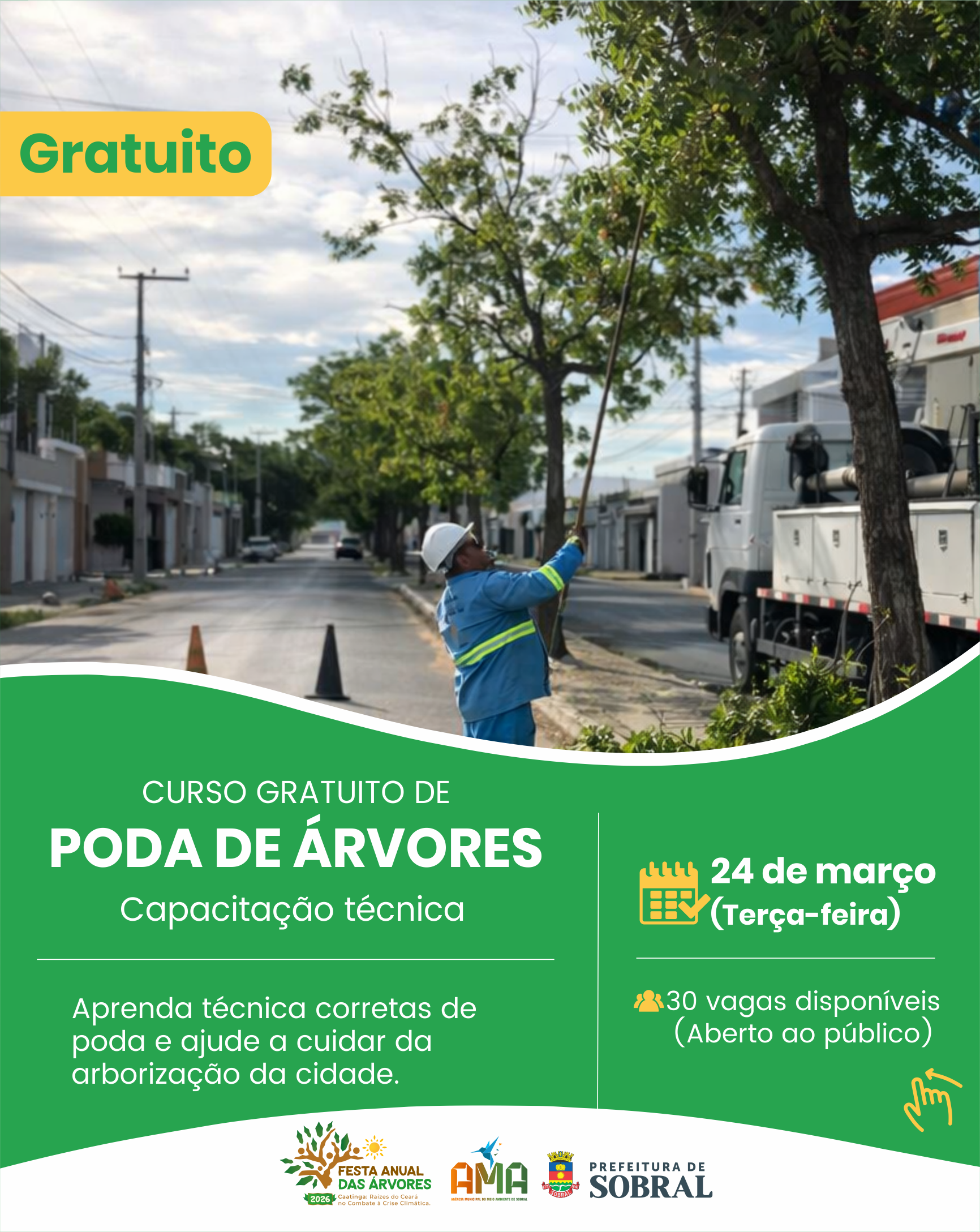 A Prefeitura de Sobral, por meio da Agência Municipal do Meio Ambiente (AMA), realiza, no dia 24 de março, um curso gratuito de capacitação em poda de árvores, voltado à população interessada em aprender técnicas adequadas de manejo e cuidado com a arborização urbana. Serão disponibilizadas 30 vagas, abertas ao público em