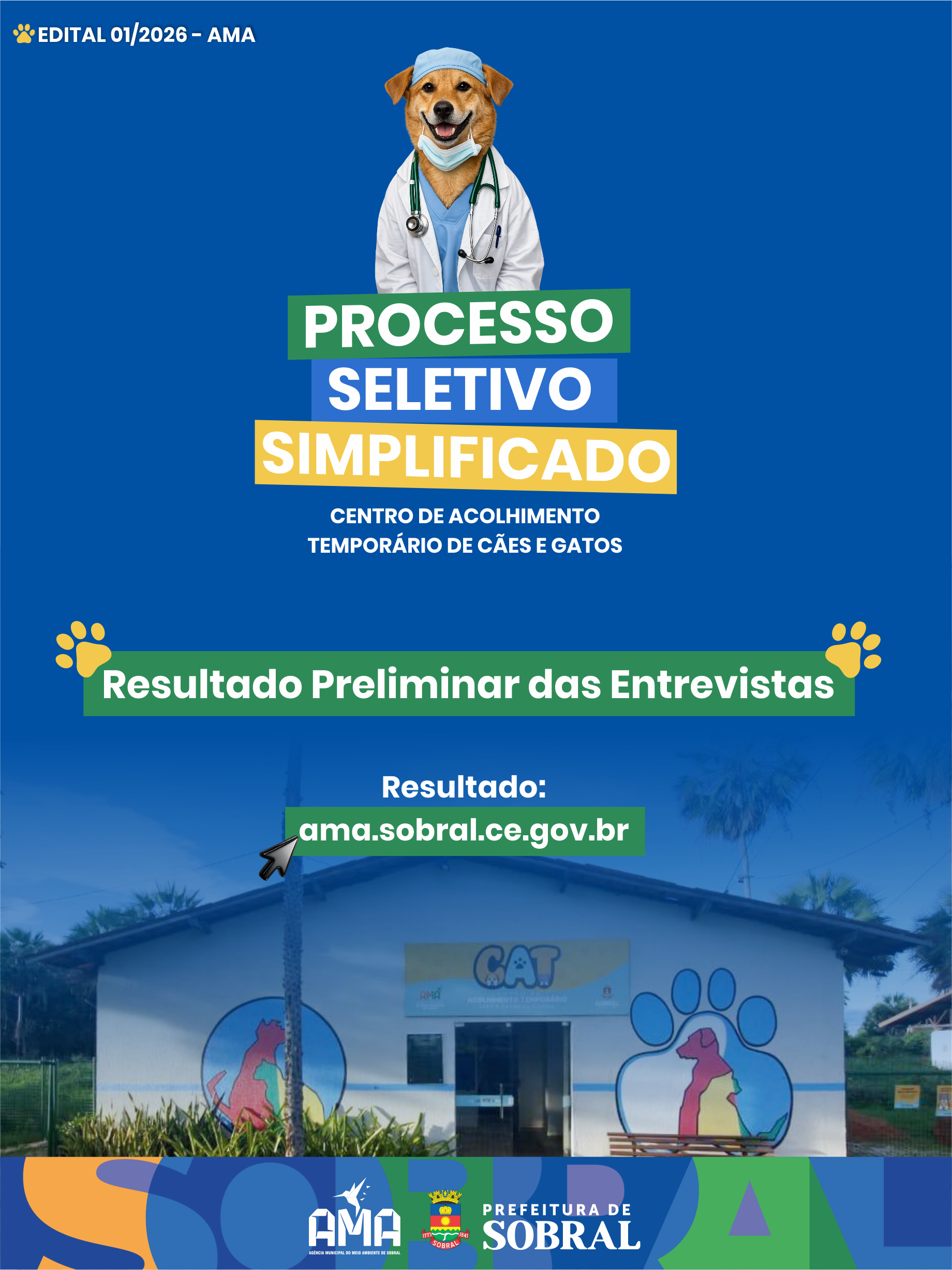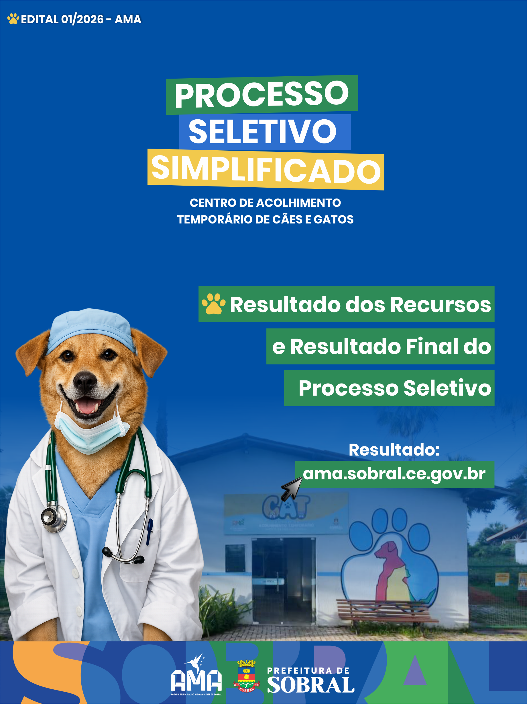 A Prefeitura de Sobral, por meio da Agência Municipal do Meio Ambiente (AMA), divulga, nesta sexta-feira (17/04), o resultado dos recursos e o resultado final do Processo Seletivo Simplificado para formação de cadastro de reserva de profissionais que atuarão no Centro de Acolhimento Temporário de Cães e Gatos (CAT).