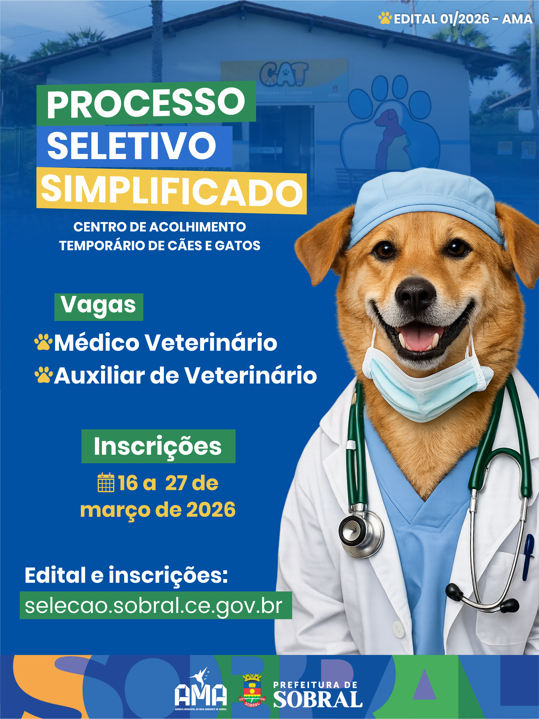 Prefeitura de Sobral abre seleção para profissionais que atuarão no Centro de Acolhimento Temporário de Cães e Gatos (CAT)