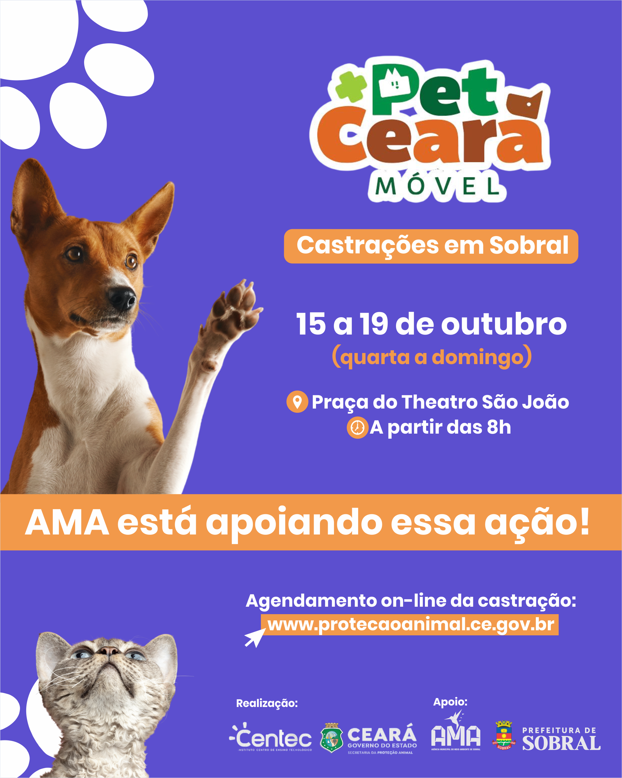 A Prefeitura de Sobral, por meio da Agência Municipal do Meio Ambiente (AMA), está apoiando o projeto Pet Ceará Móvel, uma iniciativa do Governo do Estado, realizada